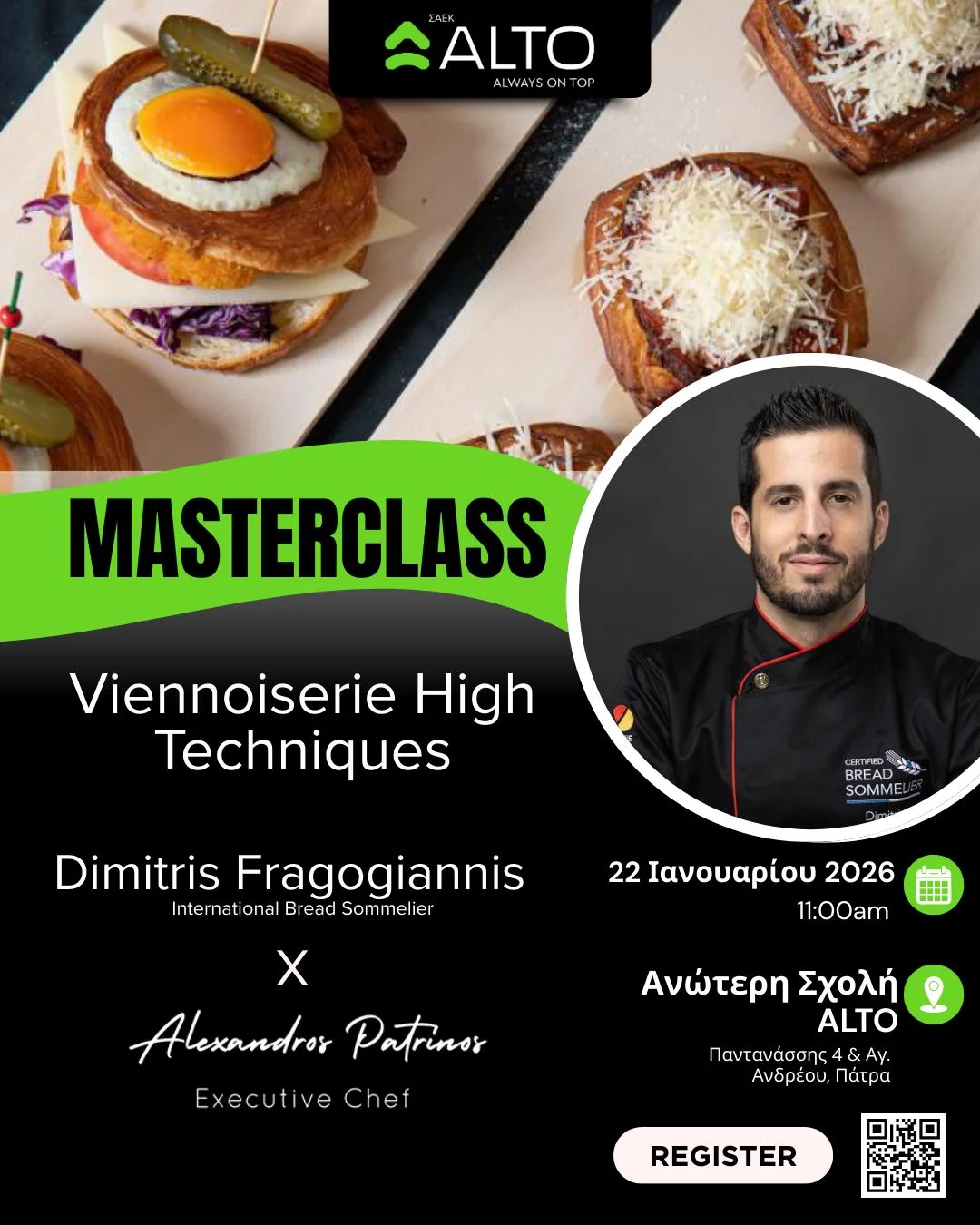 Στην Ανώτερη Σχολή ALTO με μεγάλη χαρά υποδεχόμαστε μια νέα συνεργασία με τον Δημήτρη Φραγκογιάννη, International Bread Sommelier, έναν από τους καλύτερους στο είδος του σε παγκόσμιο επίπεδο, για πρώτη φορά στην Πάτρα. Σε συνεργασία με τον Executive Chef Αλέξανδρο Πατρινό, θα παρουσιάσουν ένα εμπνευσμένο masterclass με θέμα: “Viennoiserie High Techniques”.